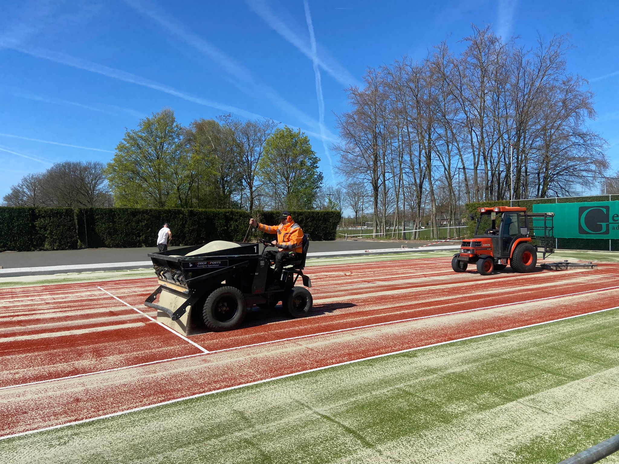 Zo is vandaag de ondergrond voor de padelbanen gestort én ligt er op tennisbaan 1 een gloednieuwe mat.